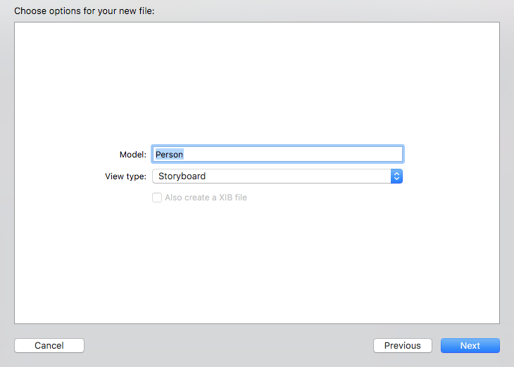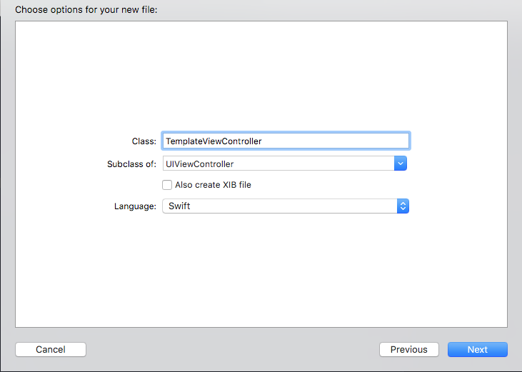 Repeat the same steps for the ViewModel file, then simply paste a regular copy of the ___FILEBASENAME__View.swift in each template subfolder. You can also create a basic XIB file in Xcode and include it in the ugly named folder XIB filegenerateXIBfile. In the XIB file you may want to edit the XML to add a FILEBASENAMEASIDENTIFIER macro to help link it to its base class.
